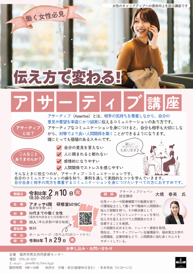 【R8/1/22】ビジネススキル講座「今の私を大切にする!こころのお手入れ講座」の開催
