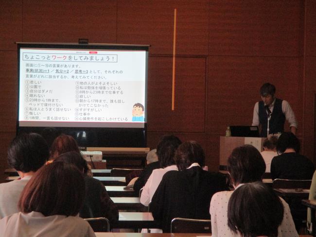 ストレスと上手に付き合うこころをつくる~認知行動療法とは~と題した講演会を開催しました。人はそれぞれ、自分なりの思考や行動パターンがあります。思考や行動が感情に与える影響を理解し、ストレスや悩み等にアプローチする認知行動療法について学びました。