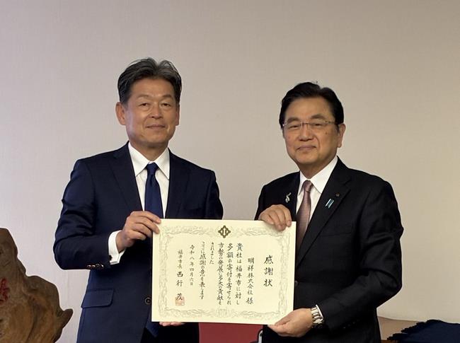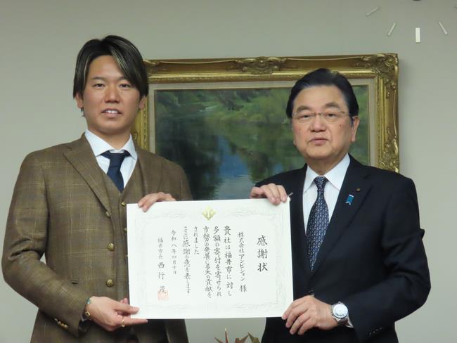 【令和8年4月10日 感謝状贈呈】 左:塚本 拓夢 代表取締役 |