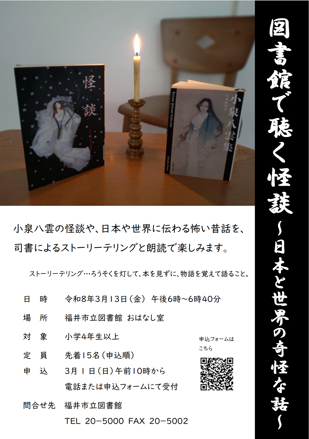 小泉八雲の怪談や、世界の怖い昔話を、司書によるストーリーテリングと朗読で楽しみます。