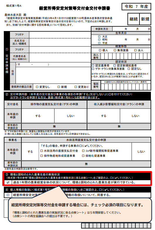 経営所得安定対策等交付金交付申請者については、交付申請書Aの「(3)環境と調和のとれた農業生産の実施状況」欄に